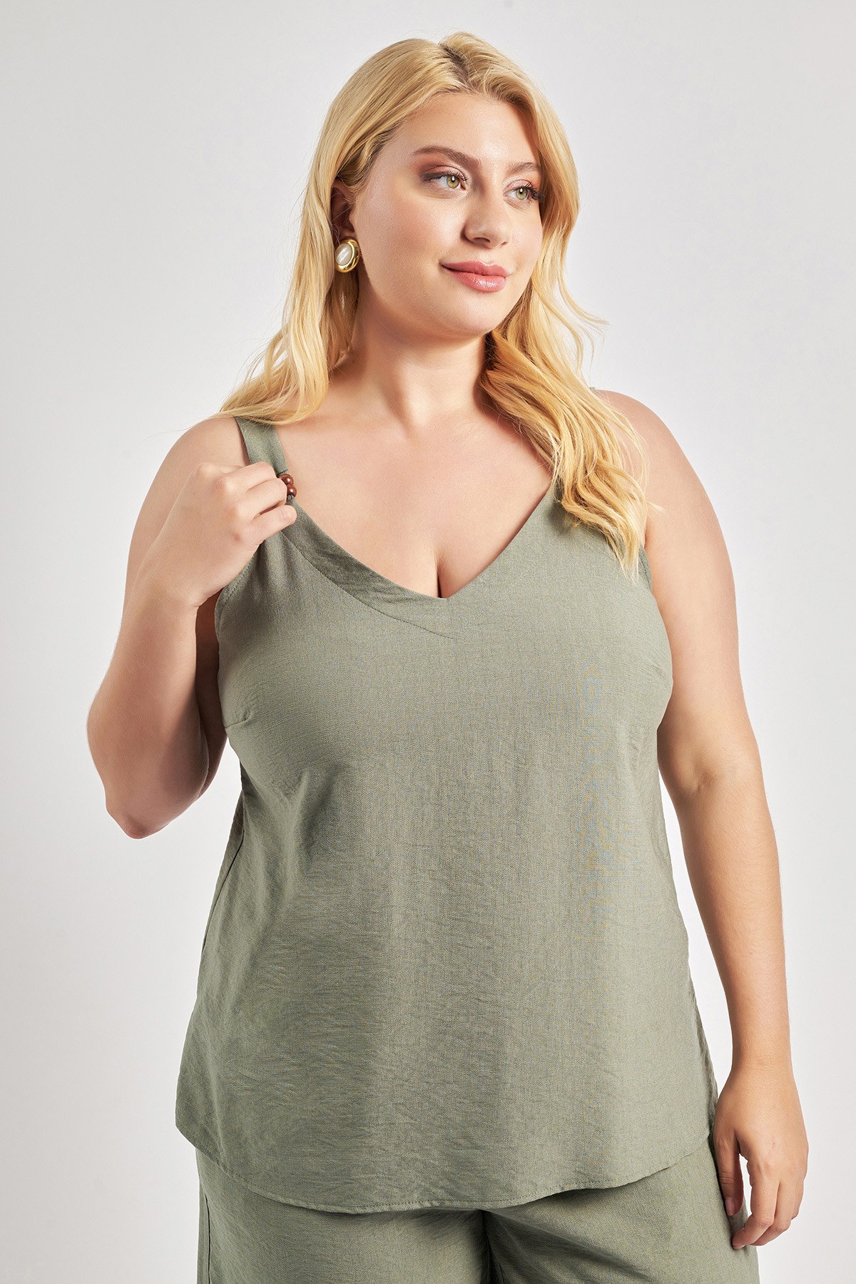 Μπλούζα με τιράντες σε ποιότητα με όψη λινού. V λαιμόκοψη. Διακοσμητικές μικρές ξύλινες χάντρες στις τιράντες. Στρογγυλεμένο τελείωμα. Κανονική εφαρμογή. Το μοντέλο έχει ύψος 177εκ, στήθος 110, μέση 85, περιφέρεια 115 και φοράει μέγεθος S