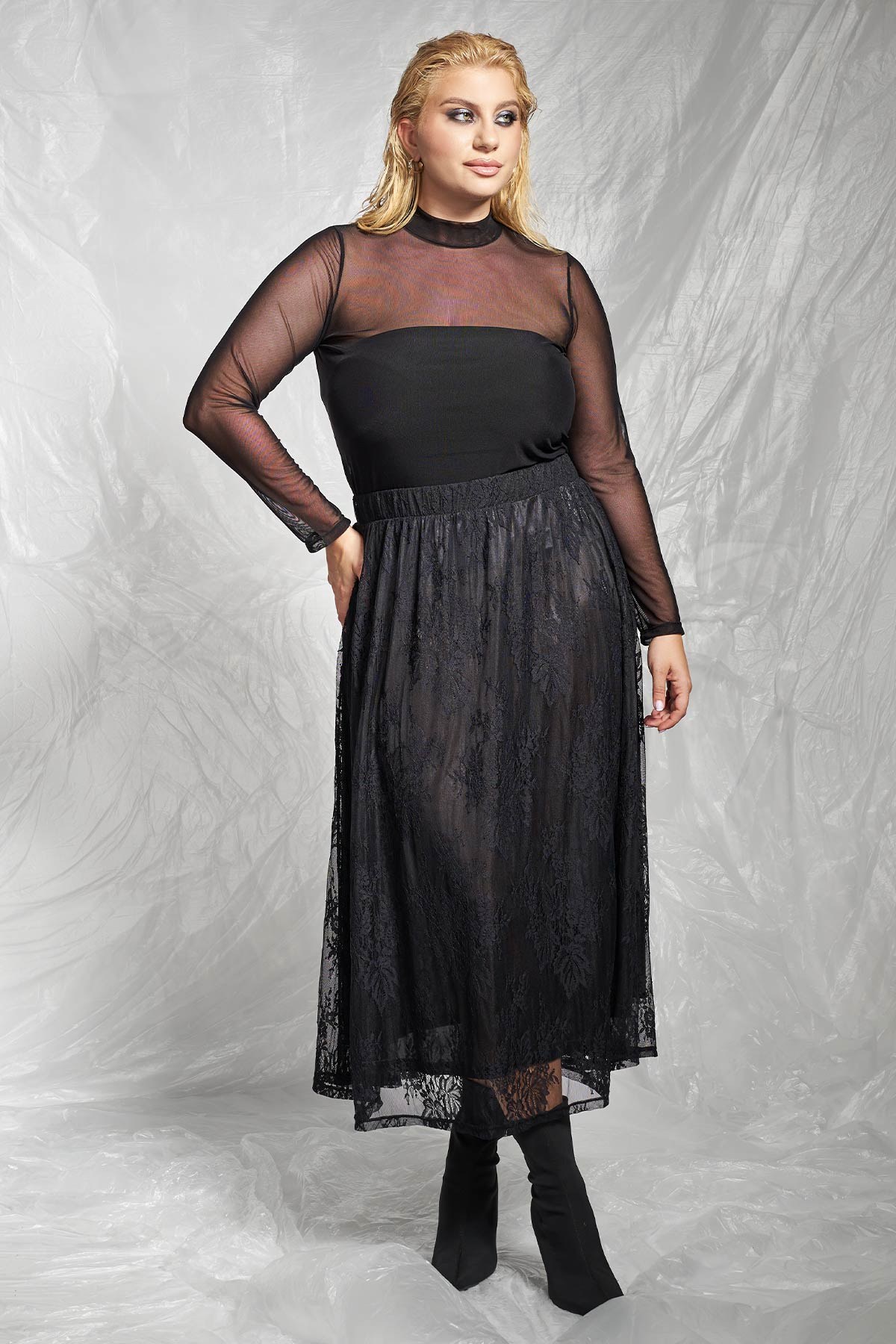 Μάξι φούστα σε Α γραμμή κλος με ψηλόμεση εφαρμογή και ελαστική μέση. Είναι κατασκευασμένη από ελαστιική δαντέλα με ανάγλυφο μοτίβο και διαθέτει πιο κοντή εσωτερική φόδρα, αφήνοντας το κάτω μέρος της δαντέλας να διαφανίζει. Η αέρινη κίνησή της προσθέτει μια ρομαντική και δραματική πινελιά σε κάθε εμφάνιση, ιδανική για επίσημες περιστάσεις ή βραδινές εξόδους. Για μια πρωινή εμφάνιση με σύγχρονη ρομαντική διάθεση, συνδυάστε τη φούστα με ένα βασικό τοπ ή t-shirt φορεμένο μέσα από τη φούστα. Εναλλακτικά, φορέστε το με ένα άνετο χουχουλιάρικο πουλόβερ και ολοκληρώστε με αρβυλάκια ή μπότες με χαμηλό τακούνι. Για μια εντυπωσιακή βραδινή εμφάνιση, φορέστε τη φούστα με το ένα δαντελένιο τοπ φορεμένο από μέσα και προσθέστε ένα εφαρμοστό, κοντό σακάκι. Ολοκληρώστε με ψηλές μπότες με λεπτό τακούνι ή μυτερές γόβες, μία statement ζώνη στη μέση και διακριτικά σκουλαρίκια. Το μοντέλο έχει ύψος 177εκ στήθος 110 μέση 85 περιφέρεια 115 και φοράει μέγεθος S