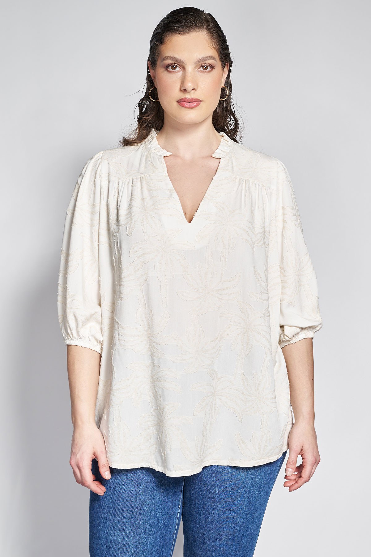 Εντυπωσιάστε με μια μπλούζα που αποπνέει πολυτέλεια και διαχρονική χάρη με την περίτεχνη υφή της που μαγνητίζει τα βλέμματα. Το σταθερό ύφασμα από σύμμεικτη βισκόζη με λινό με την μπροκάρ ύφανση, δημιουργεί ένα ανάγλυφο, διακριτικό μοτίβο, προσφέροντας βάθος στο σχέδιο και μία δόση πολυτελείας. Ξεχωρίζουν η κομψή V λαιμόκοψη με τον όρθιο γιακά, τα μανίκια τριών τετάρτων και την άνετη γραμμή του που πέφτει ομοιόμορφα στο σώμα. Για ένα καθημερινό look, φορέστε τη με ένα ψηλόμεσο τζιν παντελόνι και μπαλαρίνες, ενώ για το γραφείο συνδυάστε τη με ένα λευκό υφασμάτινο παντελόνι και διακριτικά σκουλαρίκια. Σε μια βραδινή περίσταση, αναδείξτε την πολυτελή της ύφανση με μια σατέν φούστα, ψηλοτάκουνα πέδιλα και ένα εντυπωσιακό clutch. Το μοντέλο έχει ύψος 177 εκ στήθος 98 μέση 74 περιφέρεια 113 και φοράει μέγεθος S