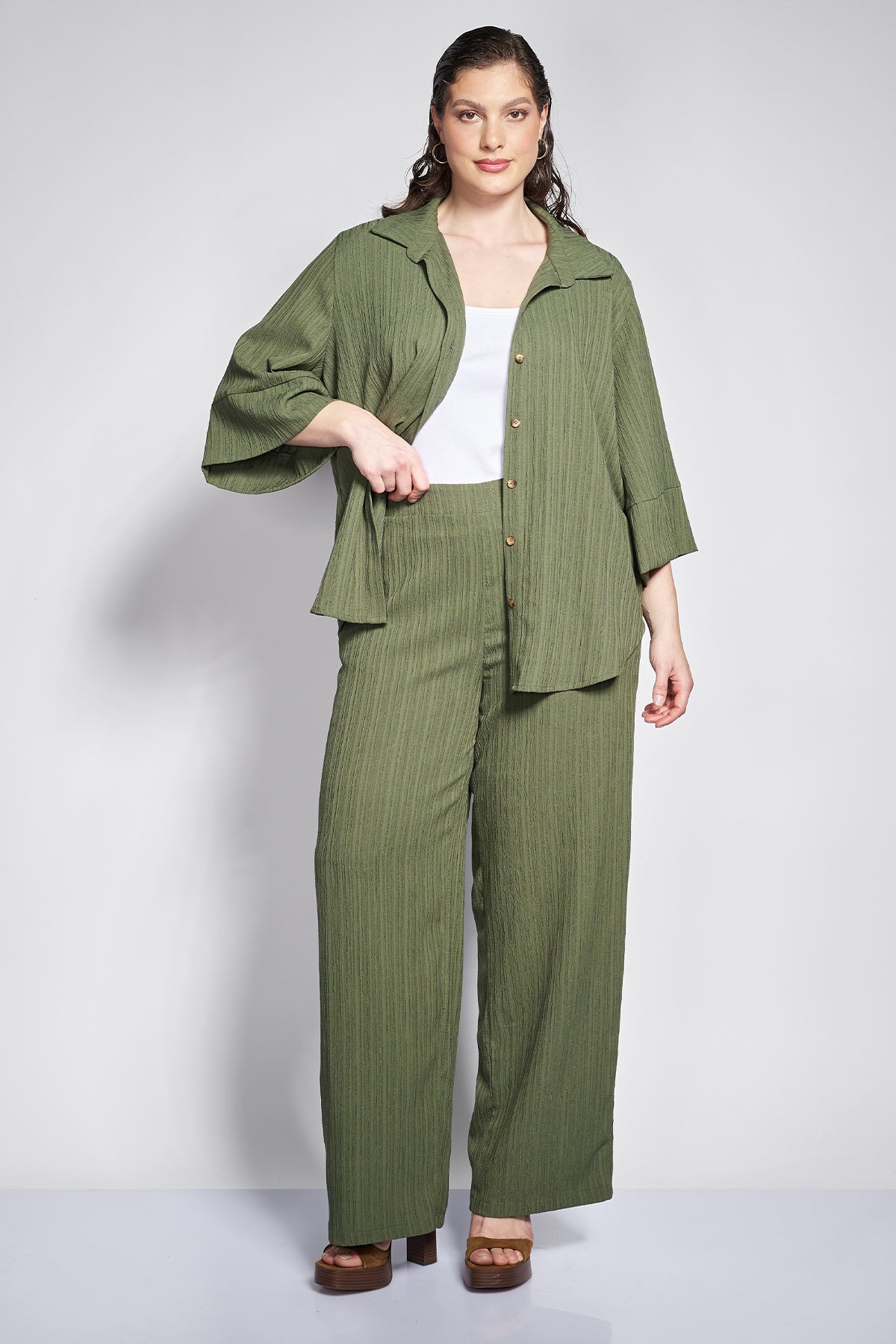 Εξασφαλίστε την απόλυτη ελευθερία κινήσεων και ένα σοφιστικέ στυλ με μια παντελόνα που επαναπροσδιορίζει την έννοια της καθημερινής άνεσης. Η ανάγλυφη τσαλακωτή ύφανση προσδίδει μια ιδιαίτερη αισθητική στο μονόχρωμο ύφασμα, ενώ η wide leg γραμμή της χαρίζει αέρινη κίνηση και κομψό όγκο. Διαθέτει ψηλή μέση με ελαστικότητα για άψογη προσαρμογή, φαρδιά μπατζάκια που πέφτουν χυτά και μακρύ μήκος που επιμηκύνει οπτικά τη σιλουέτα. Για ένα χαλαρό πρωινό look, συνδυάστε τη με ένα απλό βαμβακερό tank top και τα αγαπημένα σας δερμάτινα σανδάλια, ενώ για το γραφείο προτιμήστε ένα λευκό πουκάμισο φορεμένο από μέσα και minimal loafers. Σε μια casual chic περίσταση, προτιμήστε το total set με την αντίστοιχη πουκαμίσα 012610509593 και ψηλοτάκουνα πέδιλα που θα αναβαθμίσουν το σύνολο. Το μοντέλο έχει ύψος 177 εκ στήθος 98 μέση 74 περιφέρεια 113 και φοράει μέγεθος S
