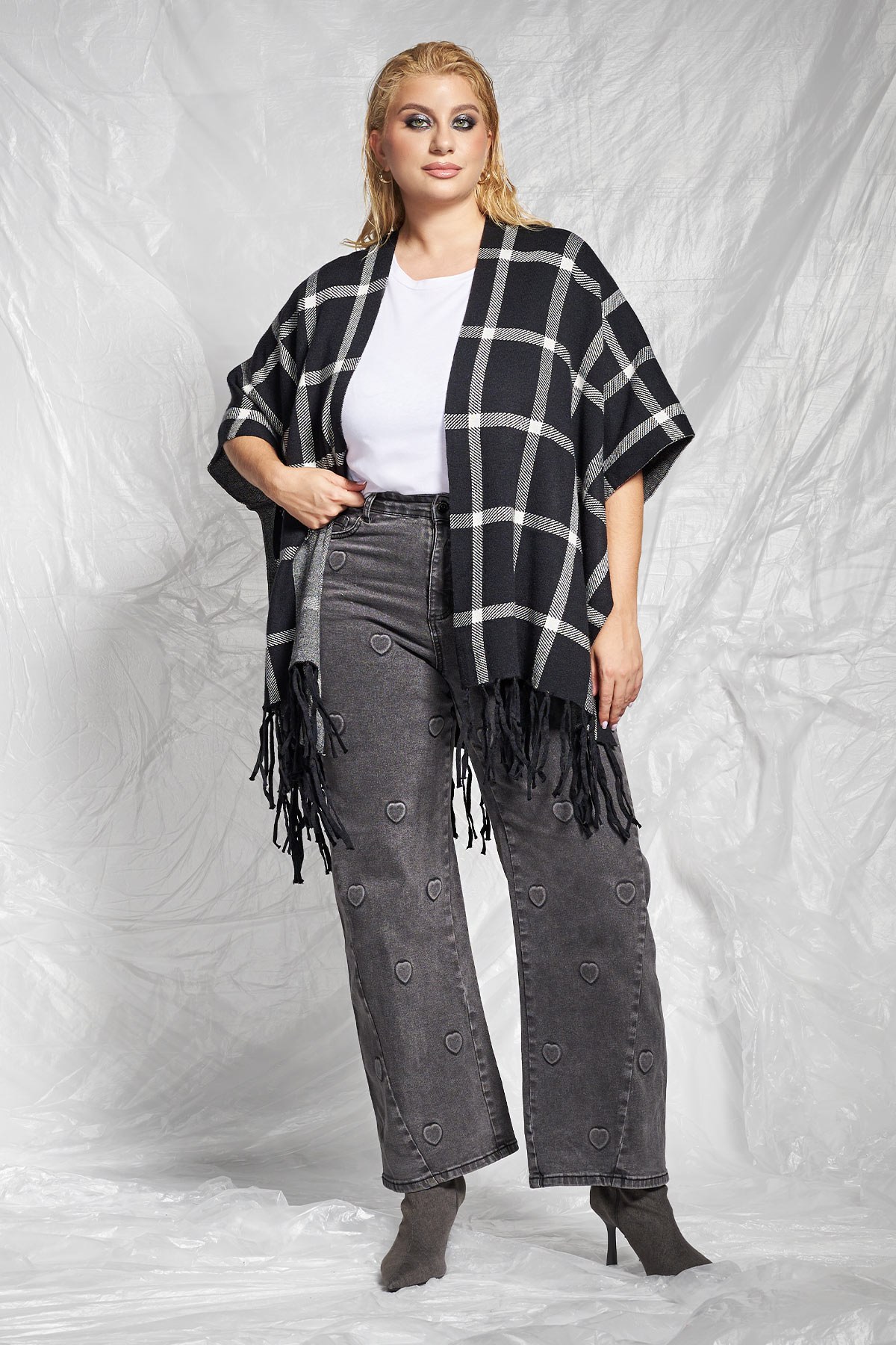 Τζιν παντελόνι με ψηλόμεση εφαρμογή και μοντέρνα γραμμή wide leg. Το ύφασμα διαθέτει ένα διακριτικό, ανάγλυφο μοτίβο με καρδιές, προσδίδοντας μια χαριτωμένη και παιχνιδιάρικη διάθεση στο κλαστικό denim. Πεντάτσεπο στυλ, με κούμπωμα με φερμουάρ και κουμπί. Για; ένα σύγχρονο casual chic:look συνδυάστε το με μία animal print ζακέτα, λευκό t-shirt, και ολοκληρώστε με μαύρα μποτάκια με τακούνι και statement ζώνη και κοσμήματα. Το μοντέλο έχει ύψος 177εκ στήθος 110 μέση 85 περιφέρεια 115 και φοράει μέγεθος S