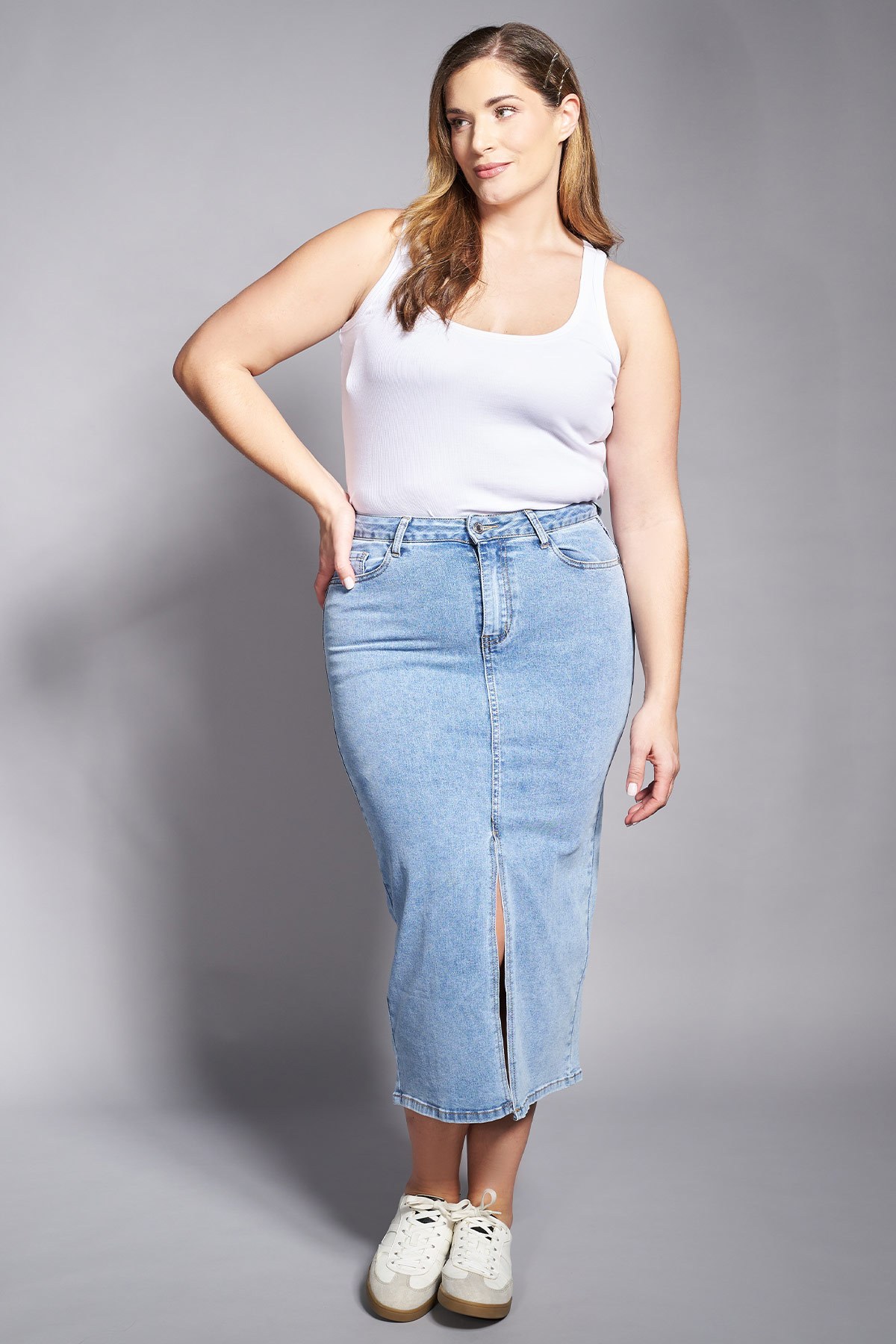 Αυτή η τζιν φούστα σε midi μήκος προσφέρει μια μοντέρνα εκδοχή ενός κλασικού αγαπημένου κομματιού. Είναι σχεδιασμένη σε ίσια γραμμή με ψηλή μέση που κολακεύει τη σιλουέτα, ενώ το μπροστινό σκίσιμο στο κέντρο προσθέτει μια δόση θηλυκότητας και διευκολύνει την κίνηση. Το ανοιχτόχρωμο “washed” χρώμα της και οι κλασικές ραφές της χαρίζουν μια ανεπιτήδευτη αίσθηση, καθιστώντας την ιδανική για ποικίλους συνδυασμούς από το πρωί έως το βράδυ. Συνδυάστε τη με ένα t-shirt και sneakers για ένα χαλαρό πρωινό look, ή με ένα μαύρο κορμάκι και mules για μια κομψή βραδινή εμφάνιση. Το μοντέλο έχει ύψος 180 εκ στήθος 107 μέση 95 περιφέρεια 122 και φοράει το μέγεθος S