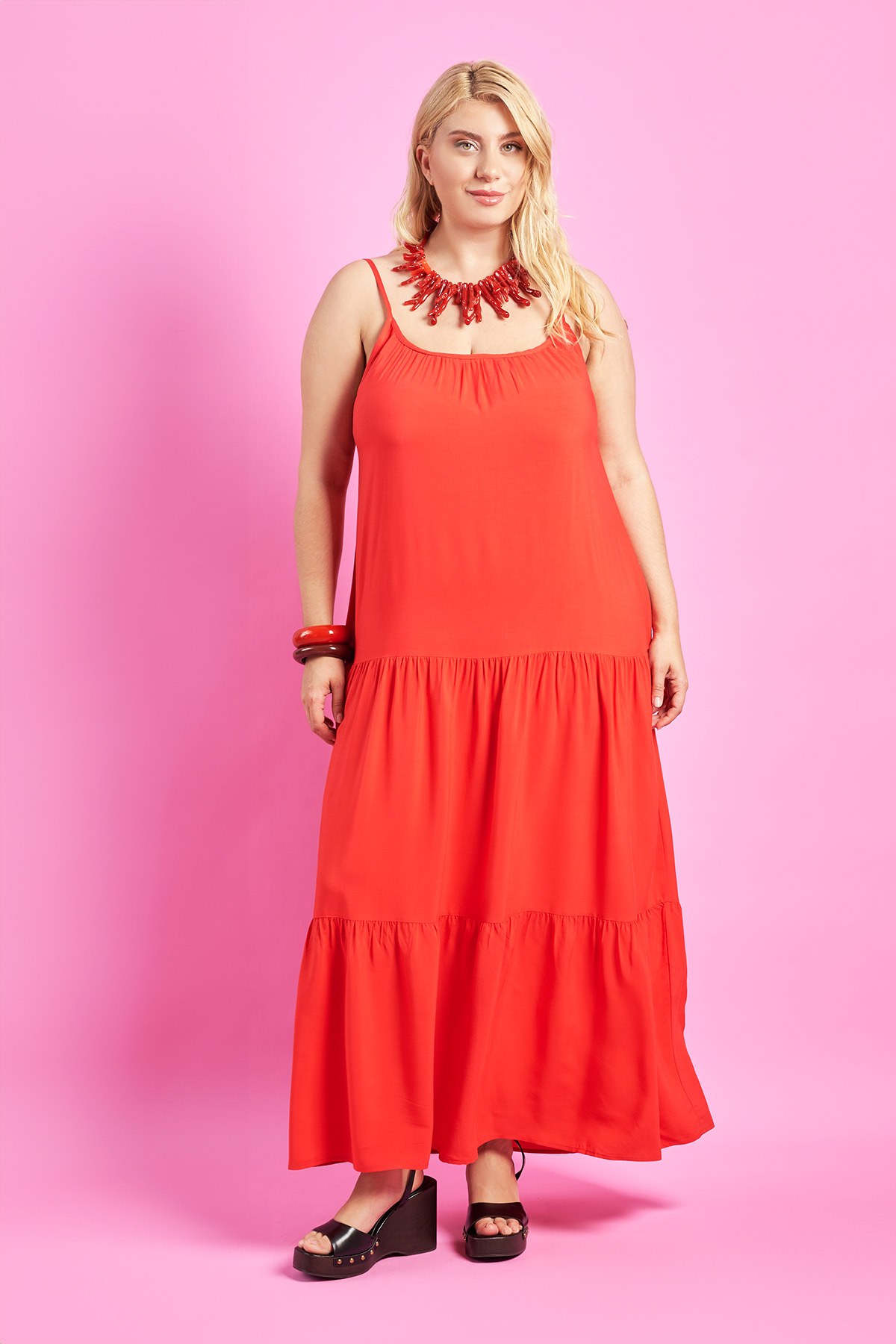 Μάξι φόρεμα από ρεγιόν με ιδιαίτερα απαλή υφή κι αίσθηση. Αμάνικο, με τιράντες. Στρογγυλή λαιμόκοψη. Σε ριχτή, κλος γραμμή με βολάν στο τελείωμα. Το μοντέλο έχει ύψος 177εκ, στήθος 110, μέση 85, περιφέρεια 115 και φοράει μέγεθος S