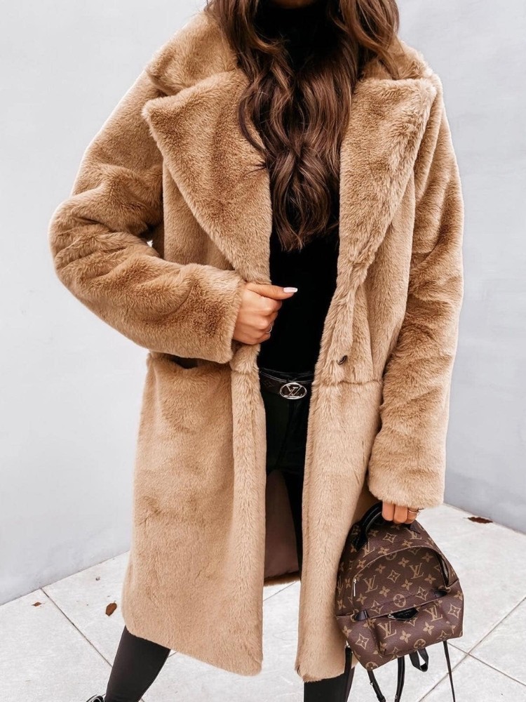 μακριά γούνα με πλαϊνές τσέπες , φοδραρισμένη κλείνει με κουμπιά  κανονική γραμμή  συνθετική γούνα