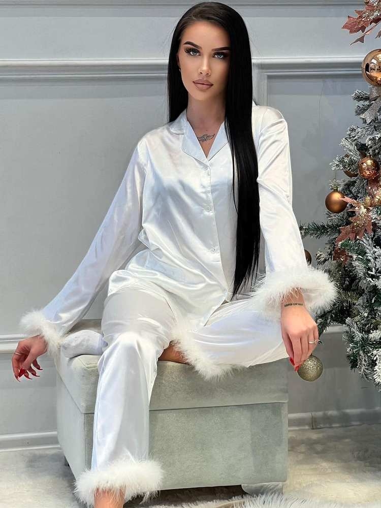 Σατεν πιτζάμες με φτερά στο τελείωμα στα μανίκια και στο παντελόνι  η μπλούζα κλείνει με κουμπάκια και το παντελόνι έχει λάστιχο στη μέση  xl περ.μεσης 112 περ.περιφεριας 158 περ.στηθους 116 *πλύσιμο στο χέρι με κρύο νερό